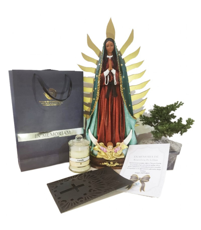 Hermosa Virgen de guadalupe de Condolencias Incluye Mini Bonsái y Vela de Cristal con Mensaje de Condolencias Impreso a Computador.